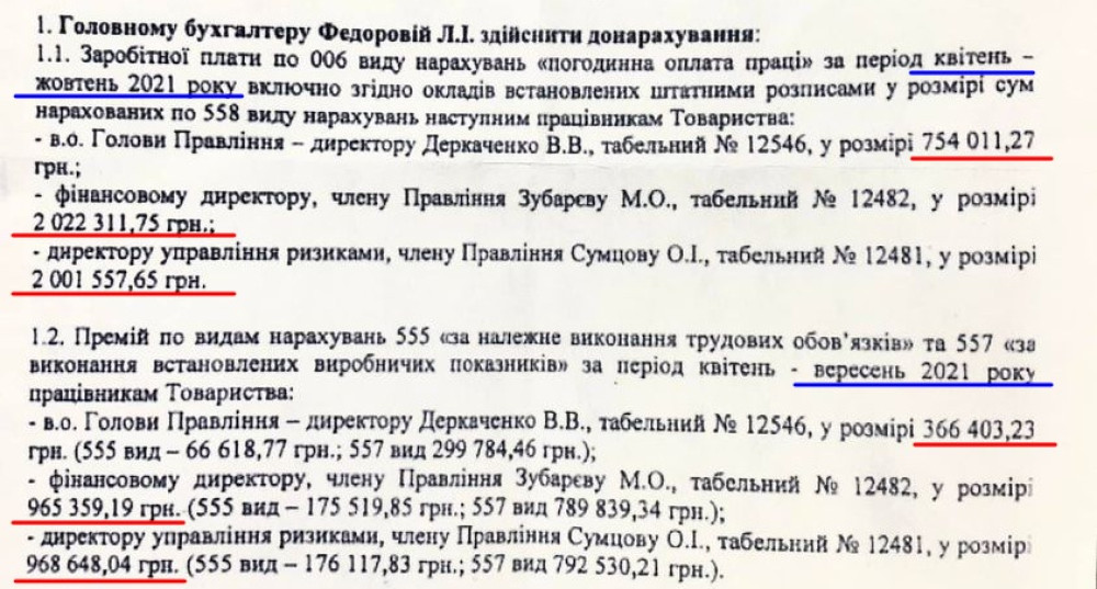 В частности, и.о. директора получил 754 тысячи гривен доплаты и 366 тысяч премии, финансовый директор и директор по управлению рисками — более двух миллионов доплат и почти по миллиону гривен премии каждый.