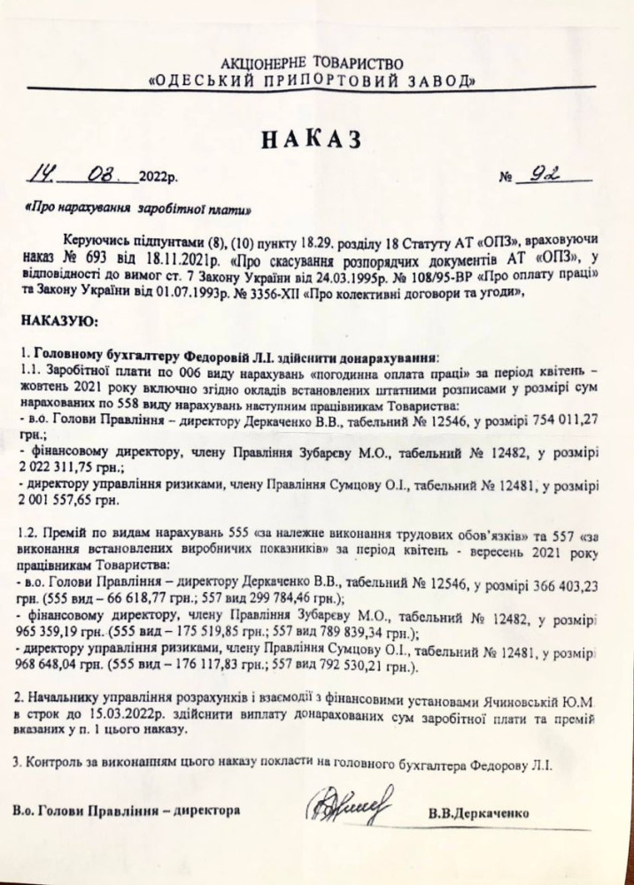 Об этом стало известно из копии приказа, который опубликовал одесский адвокат Вадим Оксюта. Общая сумма выплат трем топ-менеджерам превысила 7 миллионов гривен.