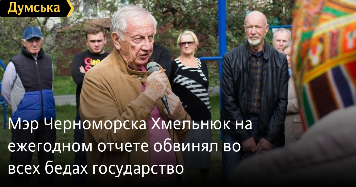 Мэр Черноморска Хмельнюк на ежегодном отчете обвинял во всех бедах государствоМэр Черноморска Валерий Хмельнюк выступил перед горожанами с ежегодным отчетом. Как сообщает «Черноморская информационная служба» (ЧИС), мероприятие состоялось во дворе дома №8 по Парковой улице в присутствии двух десятков жителей города, чиновников и нескольких депутатов горсовета. При этом любопытно, что Валерий Хмельнюк, занявший пост градоначальника как представитель правящей партии БПП «Солидарность», свой отчет практически полностью посвятил критике действующей украинской власти. В частности, именно страна, по мнению городского головы, виновата в развале порта Черноморска. Также Валерий Хмельнюк высказался на тему реформы жилищно-коммунального хозяйства, перехода от ЖЭКов к ОСМД. Кроме того, он посетовал: «Государство приняло решение, чтобы ликвидировать газеты — от района до области. Будут одни коммерческие газеты». «Критикуя и обвиняя во всех бедах «страну», Валерий Хмельнюк с гордостью вещал и о достижениях города – незаконченном строительстве моста через Сухой Лиман и гимназии, количестве предприятий на территории Черноморска и средней заработной плате в размере 10 тыс. 500 грн. А вот общение с самими жителями города не удалось – на все вопросы черноморцев мэр Валерий Хмельнюк отвечал хамством и грубостью. После очередного неудобного вопроса градоначальник на ходу крикнул: «Спасибо! Я закончил!», и быстро убежал со встречи в окружении приближенных к нему чиновников», — отмечает ЧИС. СМЕРТЬ РОССИЙСКИМ ОККУПАНТАМ! Заметили ошибку? Выделяйте слова с ошибкой и нажимайте control-enter