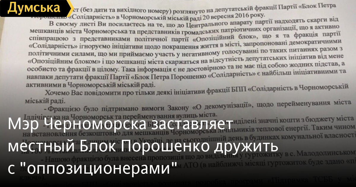 Мэр Черноморска заставляет местный Блок Порошенко дружить с «оппозиционерами»Мэр Черноморска Валерий Хмельнюк сумел убедить фракцию Блока Порошенко в местном горсовете не выполнять рекомендацию областного руководства БПП о прекращении сотрудничества с представителями «Оппозиционного блока». Об этом «Думской» сообщили в облорганизации «Солидарности». Ее зампред Михаил Шмушкович направил черноморским депутатам письмо, в котором указал на недопустимость занятой фракцией позиции. Речь идет, в частности, о совместных голосованиях с «оппозиционерами» и поддержке их кандидатуры на пост секретаря совета. После получения этого письма восьмерку черноморских «порошенковцев» собрал у себя мэр Валерий Хмельнюк и чуть ли не силой заставил подписаться под ответным документом, в котором критикуется уже областная организация. Часть депутатов колебалась, но городской голова нашел нужные аргументы и собрал подписи. Отметим, что произошло это накануне вступления в силу нормы об императивном мандате для депутатов местных советов. По нашим данным, облорганизация БПП рассматривает вопрос о применении ее к черноморским избранникам. СМЕРТЬ РОСІЙСЬКИМ ОКУПАНТАМ! Помітили помилку? Виділяйте слова з помилкою та натискайте control-enter