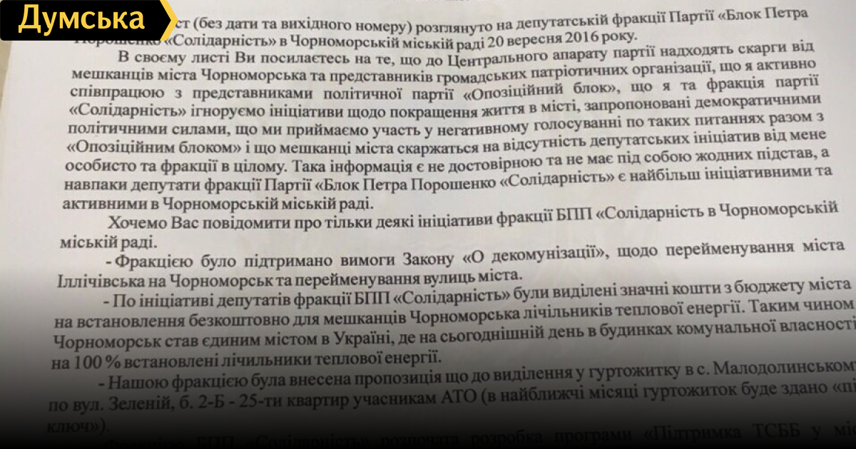 После получения этого письма восьмерку черноморских «порошенковцев» собрал у себя мэр Валерий Хмельнюк и чуть ли не силой заставил подписаться под ответным документом, в котором критикуется уже областная организация. Часть депутатов колебалась, но городской голова нашел нужные аргументы и собрал подписи.