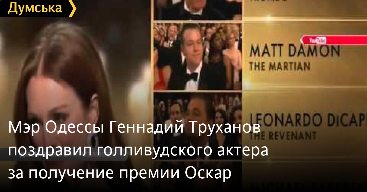 Мэр Одессы Геннадий Труханов поздравил голливудского актера за получение премии «Оскар»Мэр Одессы Геннадий Труханов поздравил голливудского актера за получение премии «Оскар» СМЕРТЬ РОССИЙСКИМ ОККУПАНТАМ! Заметили ошибку? Выделяйте слова с ошибкой и нажимайте control-enter Думская ТВ. Сюжеты: