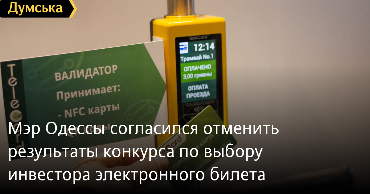 «Председатель отделения повторно отметил необходимость создания конкурентной среды при проведении конкурса по отбору инвестора для внедрения автоматизированной системы учета оплаты проезда в городском пассажирском транспорте общего пользования Одессы. Стороны согласились с тем, что решение горсовета надо отменить и провести новый конкурс», — отметили в АМКУ.