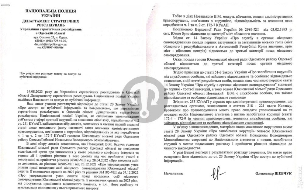 Бюро стратегічних розслідувань обласного управління Нацполіції перевірило законність дій міського голови і встановило, що міг бути допущений конфлікт інтересів — Новацький нараховував собі премії, не повідомивши про це членів виконкому міської ради.
