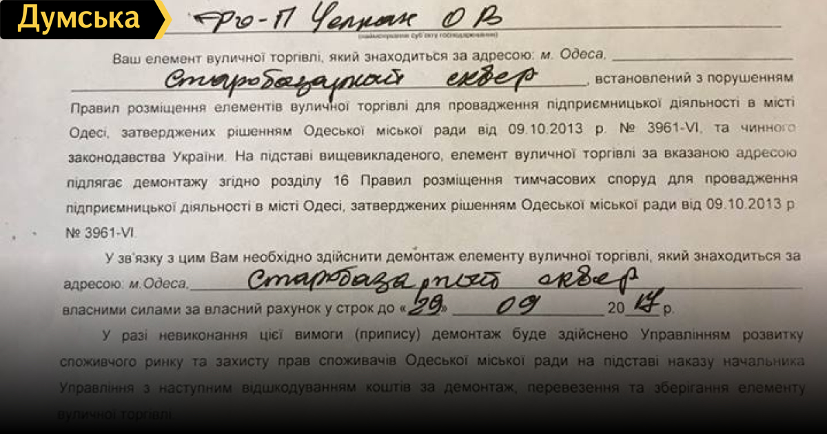 Муниципальное управление торговли изгоняет из Старобазарного сквера веревочный парк «Летучий голландец», который работает там больше трех лет. Предписание на демонтаж объекта (он начался в субботу) подписал и.о. заместителя начальника управления Сергей Дубенко. Основание — решение исполкома от 31 июля 2014 года о ликвидации трех сотен временных торговых объектов. «Летучий голландец» был установлен в зеленой зоне с нарушением правил размещения МАФов. Владельцы веревочного парка утверждают, что все документы у них есть. Договор они подписывали с КП «Горзелентрест»: «В 2013 году одесский горсовет утвердил правила размещения временных торговых сооружений. Мы попали под крыло управления развития потребительского рынка и защиты прав потребителей. В июне 2014 года без проведения каких-либо переговоров нам предписали демонтировать объект. Не имея возможности платить в бюджет дважды, мы обратились к юристам КП «Горзелентрест» с просьбой определить, к сфере влияния какой из этих двух организаций мы относимся, однако пока шли переговоры, наша детско-юношеская спортивная площадка была включена в список объектов, подлежащих демонтажу, который утвердил исполком Одесского горсовета», — жалуются в «Летучем голландце». Напомним, в начале года по заказу мэрии и бизнесменов, которым с недавних пор принадлежит туалет в Старобазарном, была разработана концепция благоустройства сквера. Вместо наземной уборной в Старобазарном появится детский центр. Также там разобьют новые клумбы, построят фонтаны, установят современную уличную мебель. Из коммерческих объектов, кроме детского центра, в сквере останутся два кафе и цветочный павильон. СМЕРТЬ РОСІЙСЬКИМ ОКУПАНТАМ! Помітили помилку? Виділяйте слова з помилкою та натискайте control-enter