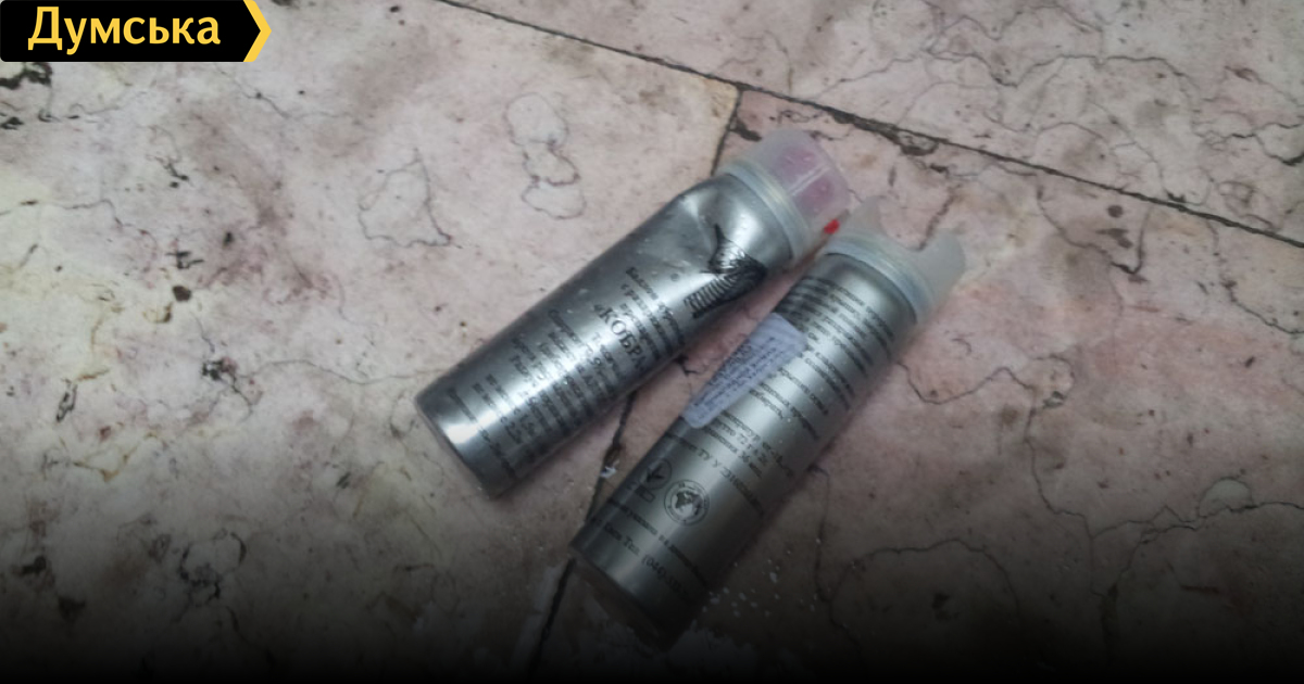 .после того, как пустили струю, умудрились выбросить баллончики внутрь фойе мэрии. Там их кто-то