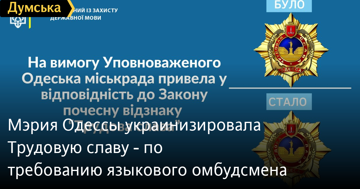 Мерія Одеси українізувала «Трудову славу» — на вимогу мовного омбудсменаОдеська міськрада привела у відповідність до Закону України «Про забезпечення функціонування української мови як державної» почесну відзнаку «Трудова слава». Про це повідомив уповноважений із захисту держмови Тарас Кремінь — саме він і домігся українізації нагороди. Тепер і сам знак, і положення про нього оновлені та виконані українською. «Мовне питання є одним із головних у веденні росією гібридної війни проти України, — зазначив мовний омбудсмен. — Наслідком таких дій з боку російської федерації стала збройна агресія проти України та окупація частини її територій. Тож у нинішній ситуації чиновники, органи місцевої влади та місцевого самоврядування мають бути на передовій захисту наших мовних кордонів». СМЕРТЬ РОСІЙСЬКИМ ОКУПАНТАМ! Помітили помилку? Виділяйте слова з помилкою та натискайте control-enter |