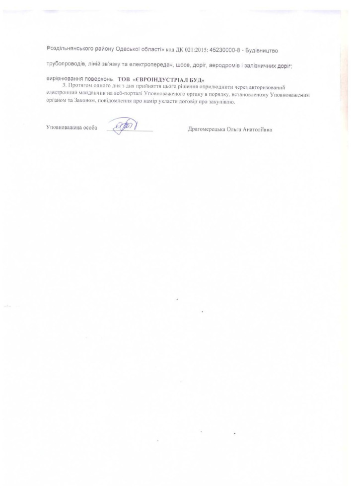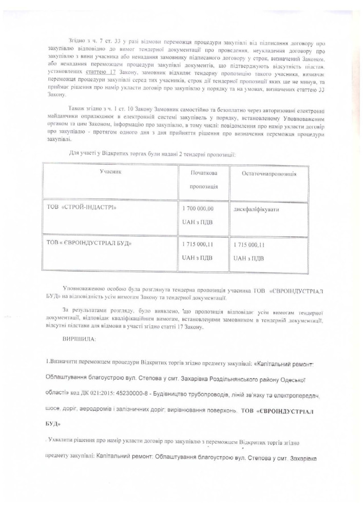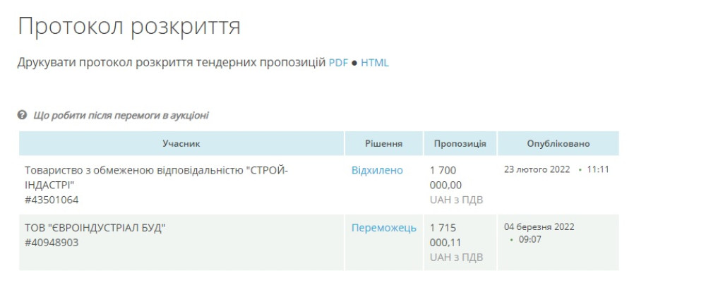 Им стала компания «ЄВРОІНДУСТРІАЛ БУД», которая получит за работу 1 млн 715 тыс. грн 11 копеек. Предложение второго участника, ООО «СТРОЙ-ІНДАСТРІ», отклонили.