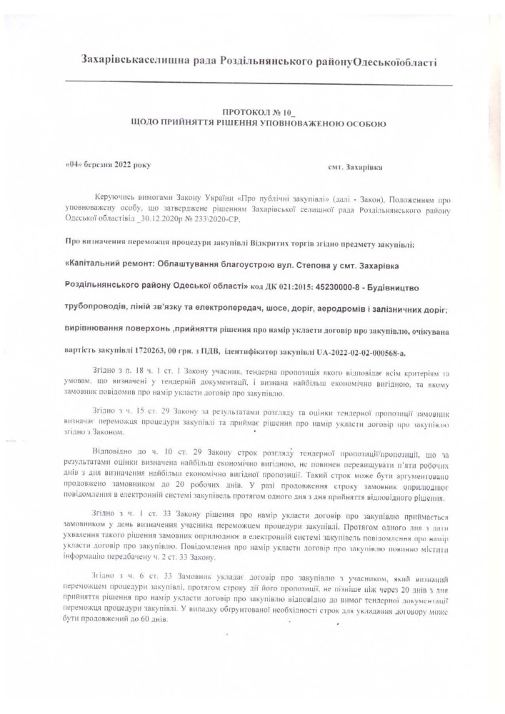 Захарьевский поссовет Раздельнянского района в условиях полномасштабной войны с нацистской Россией не нашел ничего лучше, как провести тендер по выбору подрядчика благоустройства улицы Степовой в пгт.