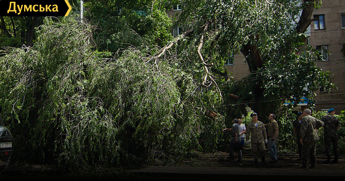 Захожу в свой двор по пр. Шевченко, 6. Бурелом. Деревья вырваны с корнем, по аллеям не пройти. Оборваны провода, и тишина. Ни рабочих, ни техники. Машины побитые стоят. И свет дали только  после шести вечера.