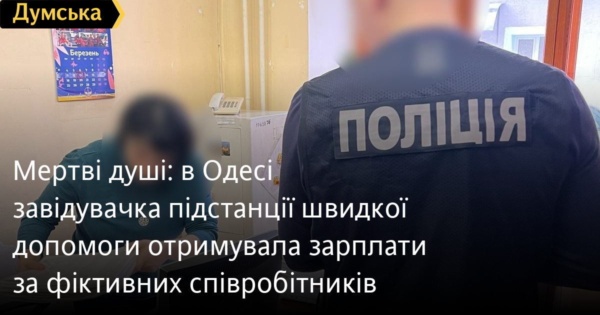 Мертві душі: в Одесі завідувачка підстанції швидкої допомоги отримувала зарплати за фіктивних співробітниківПривласнення 272 тисяч гривень на одній з одеських підстанцій екстреної медичної допомоги розслідує управління стратегічних розслідувань Нацполіції. Як повідомили правоохоронці, завідувачка підстанції та її заступник оформили на роботу фіктивних співробітників, за яких отримували зарплату. Дії медиків кваліфікували за 191-ю статтею Кримінального кодексу України (привласнення, розтрата майна шляхом зловживання службовим становищем). Помітили помилку? Виділяйте слова з помилкою та натискайте control-enter Новини по цій темі: 29 липня 2025: В Усатово Одеської області сталася перестрілка: поліція працює на місці (відео, оновлено) 28 липня 2025: П'яний на "Ягуарі" або гіпертонік? Звільнений топ-посадовець одеської поліції хоче повернутися на службу 19 червня 2025: Дівчинку, яку шукали сотні одеситів, знайшли вбитою: поліція працює з чоловіком, ймовірно причетним до загибелі 27 травня 2025: Увели гектар в університету: на Одещині засудили земельних аферистів, але без посадки і Хвоста |