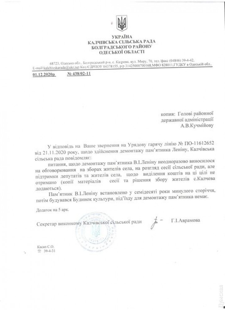 Калчевский сельсовет Болградского района Одесской области по-прежнему отказывается выполнять требования Закона Украины «Об осуждении коммунистического и национал-социалистического (нацистского) тоталитарных режимов в Украине и запрет пропаганды их символики» и сносить памятник Владимиру Ленину — последний в регионе.