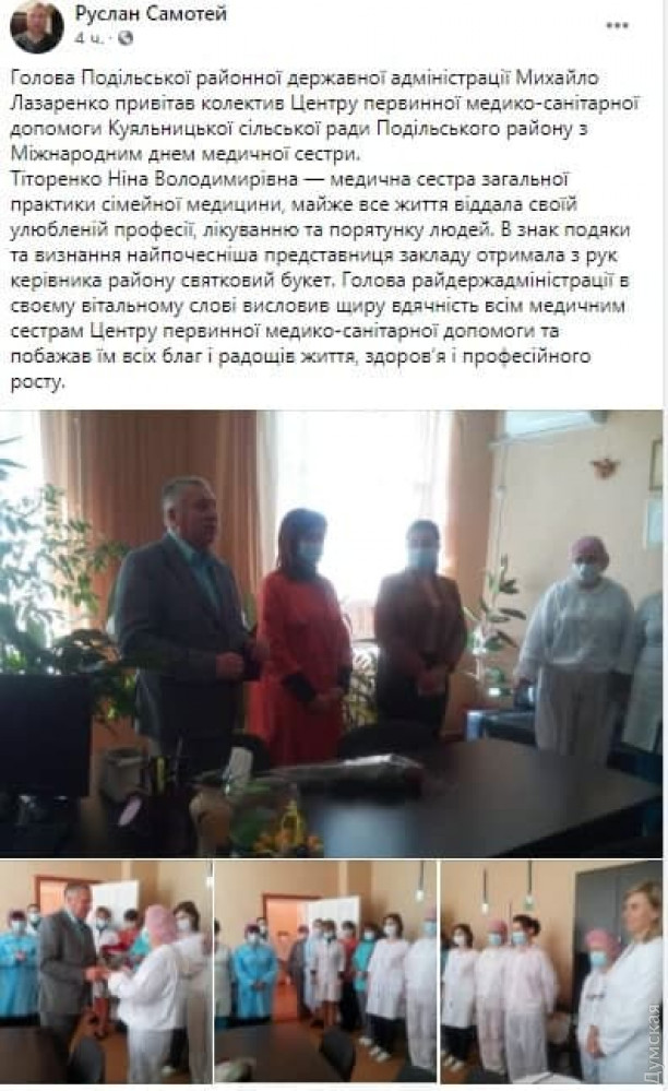 Больше всех отличился глава крупнейшего района Одесской области — Подольского. Как отрапортовала пресс-служба РГА, Михаил Лазаренко в праздничный день побывал в центре первичной медико-санитарной помощи Куяльницкой ОТГ и вручил коллективу нет, не премии и не ценные подарки, а целый «праздничный букет» из трех роз.
