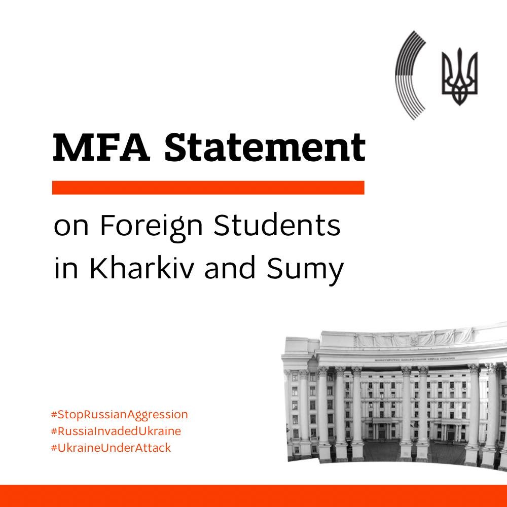 МИД Украины призывает Российскую Федерацию немедленно прекратить боевые действия в Харькове и Сумах, чтобы организовать эвакуацию гражданского населения, включая иностранных студентов.