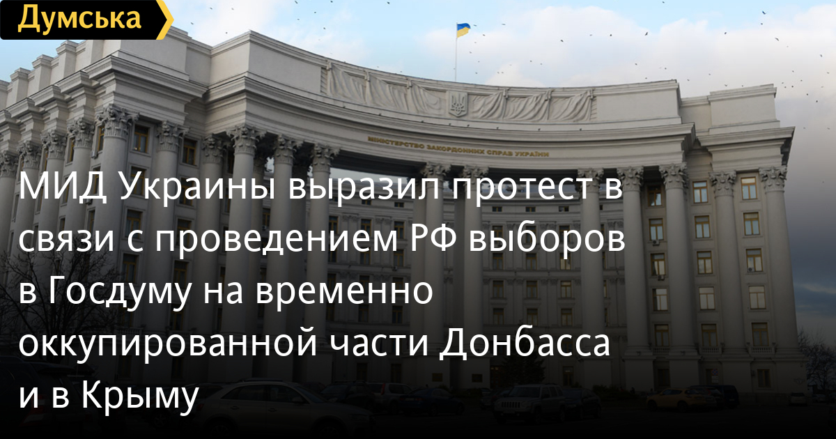 Министерство иностранных дел Украины выражает решительный протест и осуждает противоправную организацию и проведение Российской Федерацией 17-19 сентября 2021 года выборов депутатов в Госдуму на временно оккупированной территории Автономной Республики Крым и города Севастополь и принудительное привлечение к участию в этих выборах граждан Украины по выданным им незаконным способом паспортам граждан РФ на временно оккупированных территориях в Донецкой и Луганской областях.