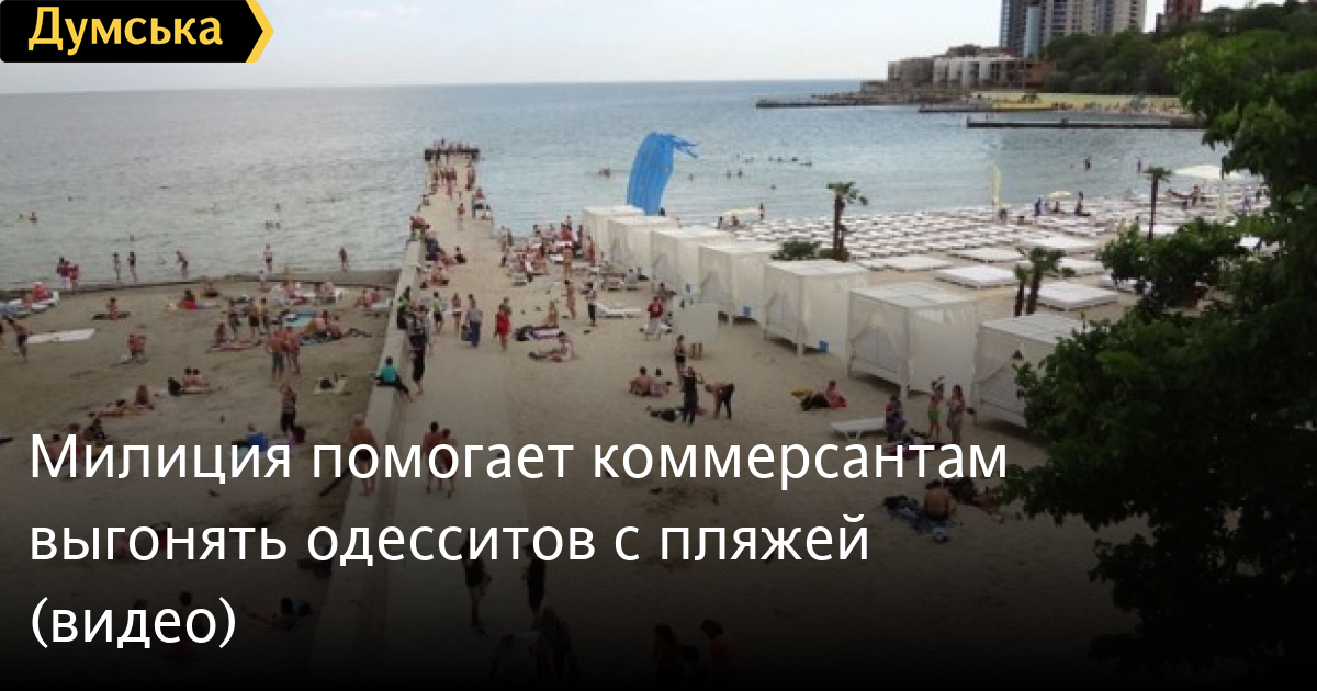 Акцент делается на работниках платных пляжей, а не на милиции, что они хотели выгнать, а милиция это способ влияния. Вот сама статья : Сегодня, 10.06.13. Мы отдыхали на пляже, в Аркадии, рядом с министериум и мы легли возле воды, меньше двух метров, когда по закону имеем лежать не больше трех. К нам начали приходить работники, грубо пытались нас выгнать, обещали предоставить бумагу, где сам лично Костусев запрещает лежать, бумагу мы так и не увидели. Работники вызвали наряд милиции, через 5 минут приехали два сотрудника милиции, которые хамским образом пытались нас выгнать, не представившись, только после просьбы представиться, один из них показал удостоверение, все это снималось на камеру, на что нас пытались под купить и забрать видео.