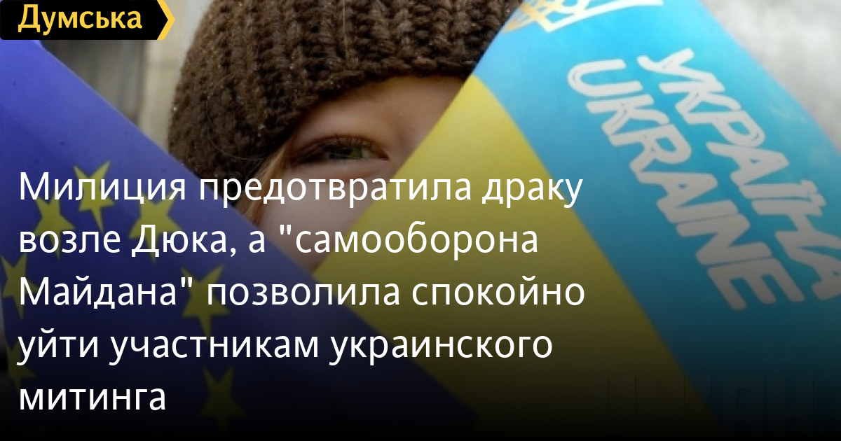 По нашей информации, они специально держали позицию возле Дюка, чтобы дать спокойно разойтись участникам митинга в поддержку независимости и территориальной целостности Украины. В итоге мирные люди с украинскими флажками не пострадали от действий агрессивно настроенных «россиян».