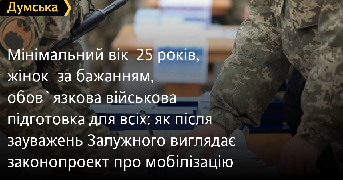 Мінімальний вік – 25 років, жінок – за бажанням, обов`язкова військова підготовка для всіх: як після зауважень Залужного виглядає законопроект про мобілізаціюВікову планку мобілізації збираються зменшити, всіх жінок мобілізувати не планують, а базова військова підготовка стане обов'язковою для всіх українців 18-25 років. Такі норми містяться у проекті змін до законів про військову службу, який незабаром зареєструють у Верховній Раді, розповіла нардеп від «Слуги народу» Мар'яна Безугла. За її словами, розробники документа врахували зауваження головнокомандувача Збройних сил генерала Валерія Залужного. Проект передбачає зниження мінімального віку мобілізації людей, які не проходили строкову службу й не закінчили військові кафедри, з 27 до 25 років. Людей, які побували в полоні, а також жінок, окрім окремих категорій на зразок медиків, мобілізувати зможуть лише у тому випадку, якщо вони самі захочуть. Перебування у полоні стане ще й підставою для звільнення з військової служби. Ще зможуть залишити армію люди, які відслужили три роки в умовах воєнного стану, та генерали – за рішенням керівництва. Строкова служба скасовується, всі військові цієї категорії звільняються та переходять у мобілізаційний ресурс на загальних підставах (з 25 років). При цьому протягом шести місяців від дня звільнення їх не можна буде мобілізувати. Держслужбовці, правоохоронці, прокурори, співробітники виконавчої служби позбавляються права на відстрочку під час постановки на військовий облік. Право на відстрочку та звільнення буде у людей з інвалідністю 1 та 2 груп, батьків трьох і більше дітей; у одного з батьків дитини, якщо і тато, і мати військовослужбовці; членів сім'ї, якщо в ній є дитина з інвалідністю та якщо в сім'ї є повнолітня особа з інвалідністю 1-2 групи (при цьому людина з інвалідністю сама обирає, кому належить відстрочка); вагітних жінок та жінок у декреті; чинних народних депутатів (колишніх прибрали). Обрання нардепом є підставою для звільнення. Крім того, і відстрочку, і право на звільнення будуть мати люди, чиї близькі родичі загинули або зникли безвісти під час війни. Відстрочка, але не право звільнитися залишиться у отримувачів вищої освіти молодше 30 років, людей із вченим званням, викладачів, які працюють на повній ставці. Пропонується прибрати категорію «обмежено придатний», залишаться лише придатні та непридатні. «Частина стане непридатною, частина придатною. Повторне проходження військово-лікарської комісії», — уточнює Безугла. Важливе нововведення, яке пропонують автори законопроекту, — базова військова підготовка на строк до трьох місяців для всіх громадян віком від 18 до 25 років у всіх навчальних закладах. Для тих, хто її не зможе пройти, організують базову військову службу за бажанням. При цьому посади в органах державної влади зможуть обіймати лише люди, які проходили таку базову підготовку чи військову службу. Зміниться процес мобілізації. Місцеві органи держвлади та адміністрації будуть зобов'язані нею займатись, а не просто сприяти, як зараз. Мобілізацію транспортних засобів розширять на всіх, окрім фізосіб. Розробники пропонують обмежити права ухилянтів на період дії воєнного стану, посилити участь Нацполіції. Нові обов'язки громадян: надавати дані про місце проживання (перебування) роботодавцю, пройти медогляд під ча
