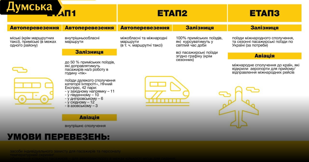 Мининфраструктуры презентовало план восстановления работы транспорта, но когда он начнет действовать – неизвестноМинистерство инфраструктуры Украины разработало план из трех этапов по восстановлению регулярного пассажирского сообщения в Украине. Об этом сообщил министр инфраструктуры Владислав Криклий. На первом этапе предполагается возобновление городских автоперевозок (кроме маршрутных такси) и пригородных (в пределах одного района), а также внутриобластных маршрутов. На железной дороге планируют запустить 50% пригородных поездов, чтобы доставлять людей с/на работу в часы «пик», а также поезда «Интерсити +» дальнего следования и ночной экспресс. Кроме того, на первом этапе предполагается возобновление внутреннего авиасообщения. Второй этап плана предполагает восстановление межобластных и международных маршрутов, в том числе разрешение на работу маршруток. Также запустят все пригородные поезда, которые будут курсировать в светлое время суток, и возобновят все пассажирские поезда по графику, кроме сезонных. На третьем этапе планируется запуск поездов международного сообщения и при необходимости — сезонных рейсов в Украину, а также возобновление международного авиасообщения в страны, которые открыли аэропорты. Правда, когда и с каким интервалом будут вводиться все эти этапы пока неизвестно. Криклий отметил, что даты этапов должны быть утверждены с МОЗ до конца текущей недели. «Работаем с авиаперевозчиками и МИД, чтобы определить страны, с которых начнется возобновление международного авиасообщения. Авиакомпании предлагают возобновлять внутренние перелеты одновременно с международными», — подчеркнул министр инфраструктуры. СМЕРТЬ РОСІЙСЬКИМ ОКУПАНТАМ! Помітили помилку? Виділяйте слова з помилкою та натискайте control-enter |