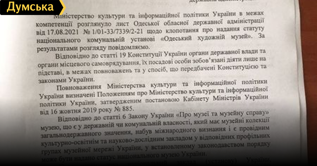 Минкульт отказался ходатайствовать о предоставлении Одесскому художественному музею статуса национального (документ)Министерство культуры и информационной политики Украины не видит оснований для предоставления статуса национального Одесскому художественному музею. Как сообщил народный депутат от «Европейской Солидарности» Алексей Гончаренко, такой ответ ведомство, которое возглавляет Александр Ткаченко, дало на обращение главы Одесской облгосадминистрации Сергея Гриневецкого. В письме министерство ссылается на постановление Кабмина «Об эффективном использовании государственных средств», которое запрещает инициировать вопрос о предоставлении учреждениям культуры и образования статуса национального, академического, исследовательского — якобы с целью экономии денег. Исключение составляют лишь несколько учреждений, в частности мемориальный комплекс Героев Небесной сотни — Музей Революции достоинства, музей истории города Киева, Музей космонавтики им. Королева. Одесского художественного в этом списке нет. «И немного об отсутствии оснований: Одесский художественный музей — один из лучших в Украине, он существует уже более 100 лет; в музее находится одна из лучших коллекций предметов искусства в Украине; тысячи людей стоят в очереди (!), чтобы попасть в музей; миллионные пожертвования перечисляли музею разные люди — от бизнесменов, звезд до политиков», — отметил Алексей Гончаренко. «Получение ОХМ статуса национального было мечтой Александра Ройтбурда (недавно скончавшегося директора музея, — Ред.), — написала в соцсетях главный редактор «Левого берега» Соня Кошкина. — Он приложил к этому много сил, и на момент кончины Саши уже большой кусок работы был проделан. Остались бюрократические процедуры на уровне Киева. В дни прощания с Сашей министр Александр Ткаченко говорил, что вопрос музея, конечно же, будет решен При наличии политического решения (которое, несомненно, должно быть в случае ОХМ) изменить постановление Кабмина — вопрос одной минуты на очередном заседании Но зачем что-то делать, если можно ничего не делать? А данные публично обещания…. Ну мало ли что кто когда говорил ». Отметим, что национальный статус, кроме прочего, означает передачу музея из совместной собственности громад региона в государственную собственность и финансирование его из госбюджета. СМЕРТЬ РОСІЙСЬКИМ ОКУПАНТАМ! Помітили помилку? Виділяйте слова з помилкою та натискайте control-enter
