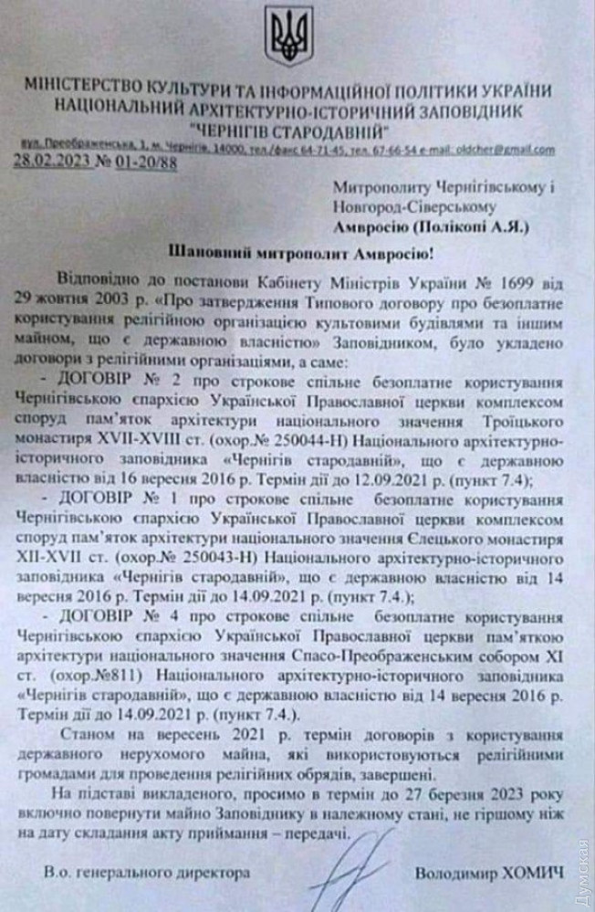 Митрополиту Чернігівському і Новгород-Сіверському Амвросію (Андрію Полікопі) з Мінкульту надійшов лист із вимогою до 27 березня покинути комплекс історичних релігійних споруд.
