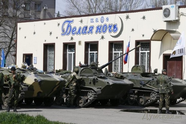В настоящее время БМД находятся возле мэрии Славянска. Возле техники находятся вооруженные люди в форме, которые не имеют отношения к Вооруженным Силам Украины.