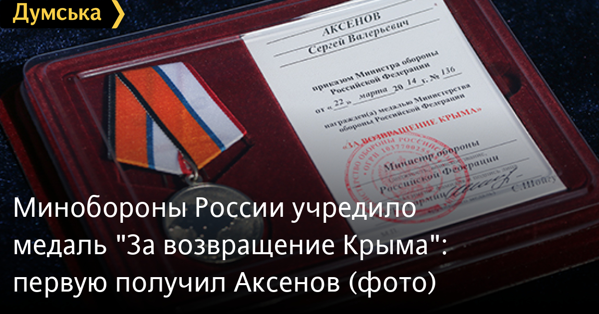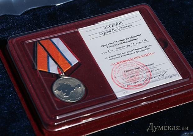 Первым медаль получил «премьер-министр» полуострова Сергей Аксенов. Также были отмечены командование Черноморского флота РФ, российские морпехи и изменившие присяге бывшие бойцы подразделения МВД Украины «Беркут».