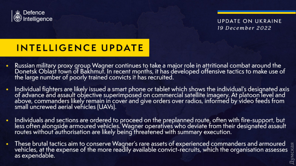 У новому розвідзведенні Міністерства оборони Великої Британії наводяться дані про тактику, використовувану російською чвк «Вагнер» під час боїв у районі Бахмута в Донецькій області.