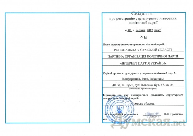 По данным Государственной регистрационной службы, Интернет партия Украины в течение шести месяцев с момента регистрации (по состоянию на 26 января 2012 года) не создала и не зарегистрировала областных и приравненных к ним организаций.