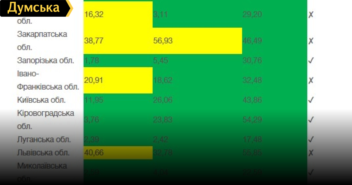 Не соответствуют требованиям Винницкая, Волынская, Житомирская. Закарпатская, Ивано-Франковская, Львовская, Ровенская, Тернопольская, Черновицкая области и столица.