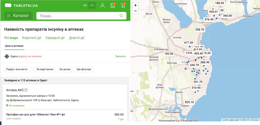 Также аптеки с инсулином можно найти при помощи сервиса Tabletki.ua. На главной странице сайта есть ссылки и карта с аптечными учреждениями.