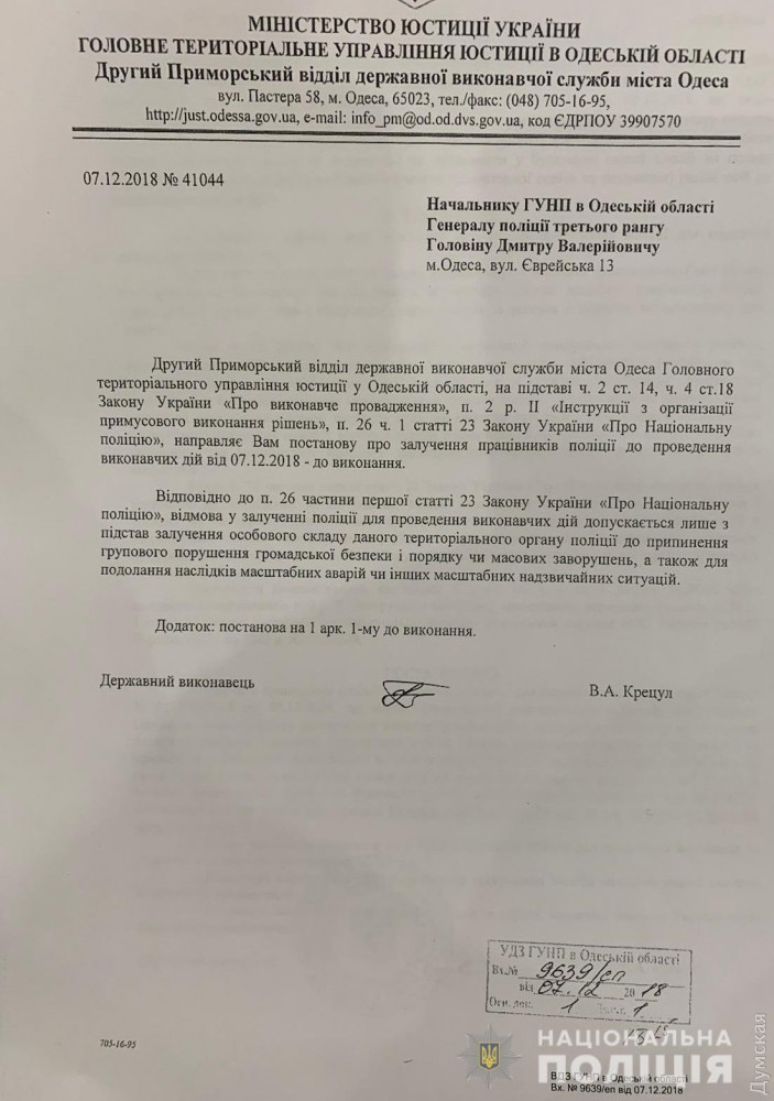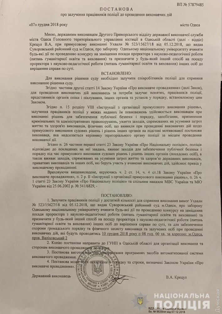 «Вчера, 10 декабря, представители Национальной полиции в Одесской области обеспечили доступ судебных исполнителей в помещение Одесского национального медицинского университета, где ими было озвучено исполнительное предписание по решению суда. После этого сотрудники полиции покинули территорию заведения. Поэтому к тем событиям, которые имели место в дальнейшем в стенах университета, полиция отношения не имеет», — говорится в сообщении пресс-службы ГУНП.