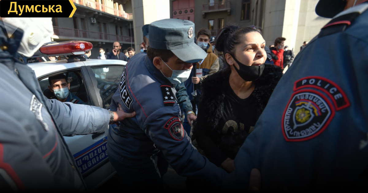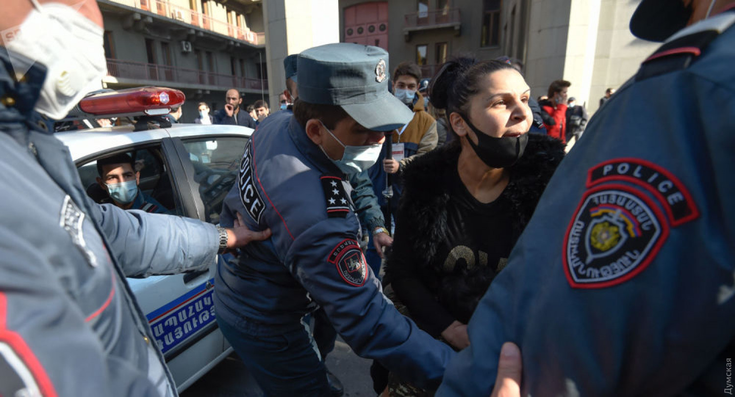 Сегодня в центре Еревана проходит митинг против подписания трехстороннего соглашения о перемирии в Нагорном Карабахе. Об этом сообщает издание «Sputnik Армения» Протестующие требуют отставки премьер-министра Армении Никола Пашиняна, потому что считают подписание вышеуказанного документа капитуляцией. Правоохранители оцепили площадь Свободы в центре города. Между митингующими и силовиками начались стычки, одного полицейского протестующие избили. Правоохранители в свою очередь пытаются задержать лидеров протестов. Отмечается, что оппозиция организовала митинг несмотря на то, что в стране действует режим военного положения. Силовики начали свозить в отделения оппозиционных политиков еще до начала акции, а затем приступили к массовым задержаниям участников протеста. На данное время задержаны по меньшей мере 129 человек. Среди них - лидер оппозиционной партии «Процветающая Армения» Гагик Царукян. Напомним, днем ранее президент Армении Армен Саркисян возмутился тем, что до подписания соглашения с ним не проводилось никаких консультаций, и он узнал о нем из прессы. После того, как стало известно о том, что президенты РФ и Азербайджана, а также премьер-министр Армении подписали соглашение о перемирии в Нагорном Карабахе, недовольные этим решением граждане Армении вышли на митинги и захватили здание парламента. СМЕРТЬ РОСІЙСЬКИМ ОКУПАНТАМ! Помітили помилку? Виділяйте слова з помилкою та натискайте control-enter |