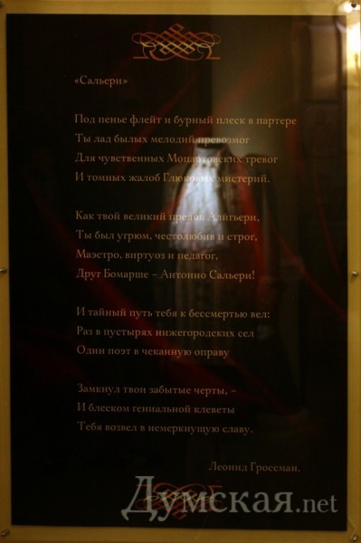 В одесской Опере прошла генеральная репетиция будущей премьеры — спектакля «Гений и злодейство». Проект, по словам руководства театра, совершенно новый как для Одессы, так и для оперы. Постановка представляет собой полностью «одесский продукт» — творческая группа состоит исключительно из одесситов. Одесситы писали сценарий, либретто и ставили балетные па. К слову, Антонио Сальери играет народный артист Украины Василий Навротский. Театр решил представить историю Моцарта и Сальери комплексно — рассказать легенду и показать факты. На сцене в опере демонстрируют легенду. А когда музыка в зале стихает, зрителей приглашают в помещение касс театра – посмотреть «факты» о жизни и творчестве Антонио Сальери на выставке «… и Сальери». Экспозицию «под постановку» руководству оперного театра помогли подготовить сотрудники Литературного музея. По словам художественного руководителя проекта Лалы Алескеровой, на выставке даже не требуется экскурсия, все экспонаты говорят сами за себя. Здесь зрителю представлена подлинная биография Антонио Сальери на фоне художественной легенды о нем. Фото: Гиманов Александр СМЕРТЬ РОСІЙСЬКИМ ОКУПАНТАМ! Помітили помилку? Виділяйте слова з помилкою та натискайте control-enter |
