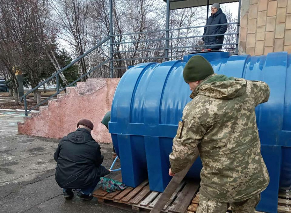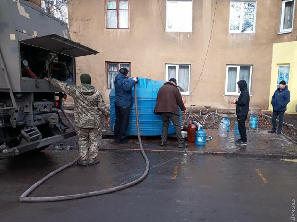С помощью спецтехники морпехи заливают воду в большие пластиковые баки, которые расставили по городу, чтобы жители могли набирать воду.