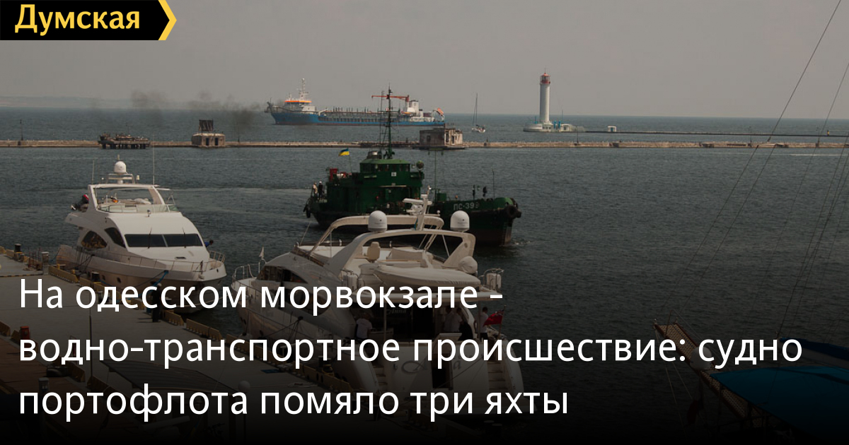 «На одесском морвокзале — водно-транспортное происшествие» Это называется проще, короче и правильнее = НАВАЛ. И произошло это не на территории (земля) яхт-клуба, а на АКВАТОРИИ (вода) яхт-клуба. «ПС-399» тип судна = сборщик льяльных вод, но никак не буксир. Человеческих жертв нет, а вот пострадавшие одушевлённые и неодушевлённые явно имеются. Сразу капитана-см.механика (см.капитана-см.механика) «ПС-399» винить не следует. Могла отказать машина, мог внезапно налететь шквал. Кстати, на мотояхтах следует вахтенной службе наблюдать за подходящим судном и быть готовым к принятию соответсвующих мер.