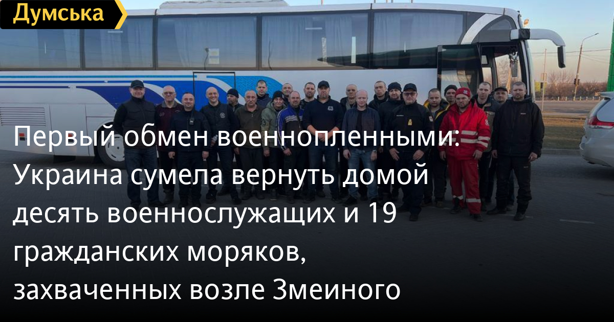 «В обмен на десять захваченных в плен оккупантов мы вытянули десять наших военнослужащих, — сказала она. — Кроме того, мы отправили россиянам 11 гражданских российских моряков, которых мы спасли с затонувшего возле Одессы судна. В результате этого обмена домой возвращаются 19 украинских гражданских моряков со спасательного судна «Сапфир», которые были захвачены оккупантами при попытке забрать наших военных с острова Змеиный. По условиям обмена, само судно тоже будет возвращено в Украину, сначала его отправят в турецкий порт».