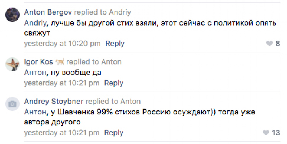 Большинство украинцев в соцсетях оценили «пасхалку» студии GSC Game World позитивно и назвали ее удачным троллингом. А вот россиянам стихотворение не понравилось. В русскоязычном Фейсбуке геймеры считают, что разработчики политизируют игру.
