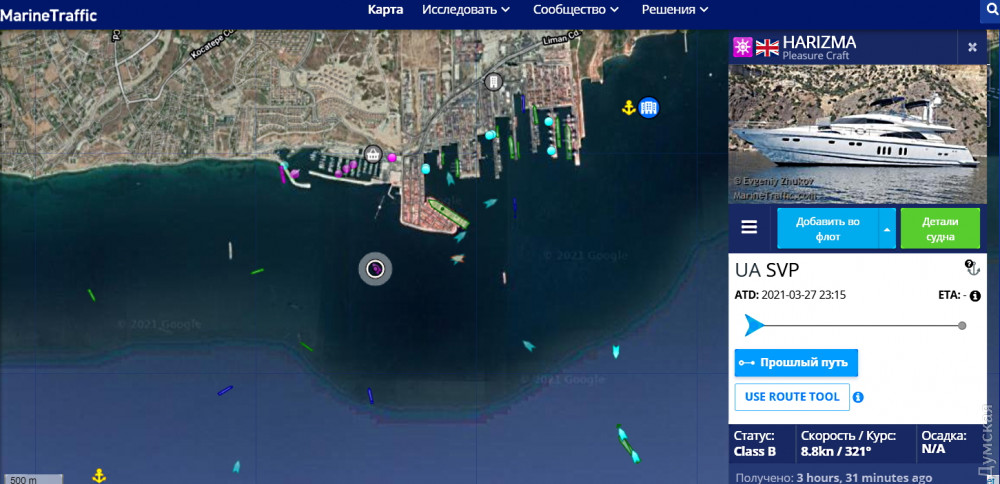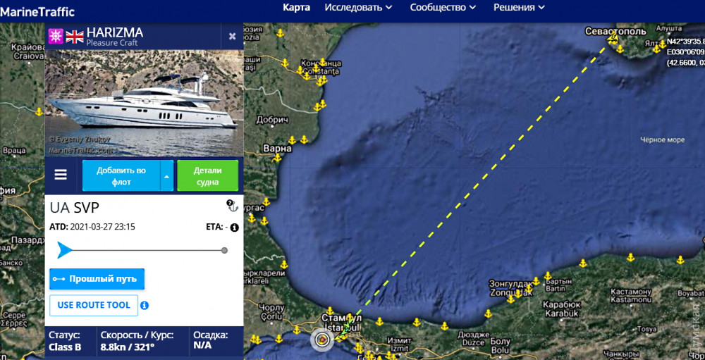 По его словам, несмотря на санкции ЕС и многократные заявления правительства Турецкой Республики о недопустимости заходов судов в крымские порты, яхта Harizma вышла 27 марта со стоянки в Южной бухте Севастополя, а сегодня, примерно в 10 часов, пройдя Босфором, прибыла в одну из гаваней Стамбула.