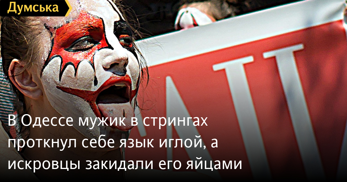 В Одессе «мужик в стрингах» проткнул себе язык иглой, а «искровцы» закидали его яйцамиЕвгений Довлатов, названный одесскими СМИ «мужиком в стрингах» за свою любовь к оголению во время общественных акций, снова эпатировал одесситов с целью привлечения внимания общественности к проблеме обманутых вкладчиков «Альянса». Сегодня прямо на пороге одесского цирка организация «Креативная молодежь плюс» во главе с Евгением провела акцию против «джинсы» в СМИ. «Инвесторы одесских недостроев устали стучаться во все двери с просьбой о помощи, а некоторые СМИ, вместо объективного освещения ситуации пишут заказные статьи», — завил Довлатов и в знак протеста снова оголил свои филейный части, украшенные надписью «Мой PR». После этого он проколол себе язык иглой от медицинской системы. Представитель инвесторов недостроя на улице Головковской 5 и 7 Людмила рассказала, что городские власти помогают инвесторам «Альянса» с поселка Котовского, а обманутых вкладчиков с Головковской не хотят даже видеть. «На нас натравили милицию. Нас выслеживают по одному и угрожают. Но самое смешное, что нам предлагают взять разворованный котлован в кооператив и заплатить еще раз за свои квартиры. Чтобы доказать, что мы не клоуны с закрытыми ртами, которые не способны себя защитить мы и решили провести эту акцию», — сказала она. Под конец акции на месте событий появились активисты организации «Общество социал-активистов «Искра», как всегда одетые в тельняшки и маски-балаклавы. Они начали кидать в сторону Довлатова и инвесторов куриными яйцами. Возмущенный происходящим «мужик» сорвал с нескольких «искровцев» маски, те, впрочем, не особо сопротивлялись. СМЕРТЬ РОССИЙСКИМ ОККУПАНТАМ! Заметили ошибку? Выделяйте слова с ошибкой и нажимайте control-enter |
