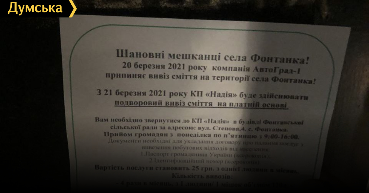 На улицах села уже появились объявления, призывающие граждан подписывать договоры с КП. Стоимость услуги составит 25 гривен с человека в месяц. За эти деньги коммунальный мусоровоз будет раз в неделю объезжать дома, забирая отходы — не более 120 литров на одного жителя.