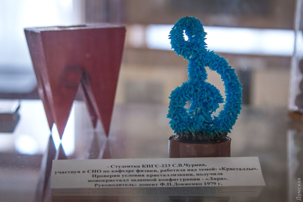 Несколько стендов посвящены прикладным научным разработкам сотрудников академии: от керамзитобетона и монокристалла, выращенного в форме скрипичного ключа, до огромной камнерезной машины, взявшей диплом третьей степени на ВДНХ в Киеве.