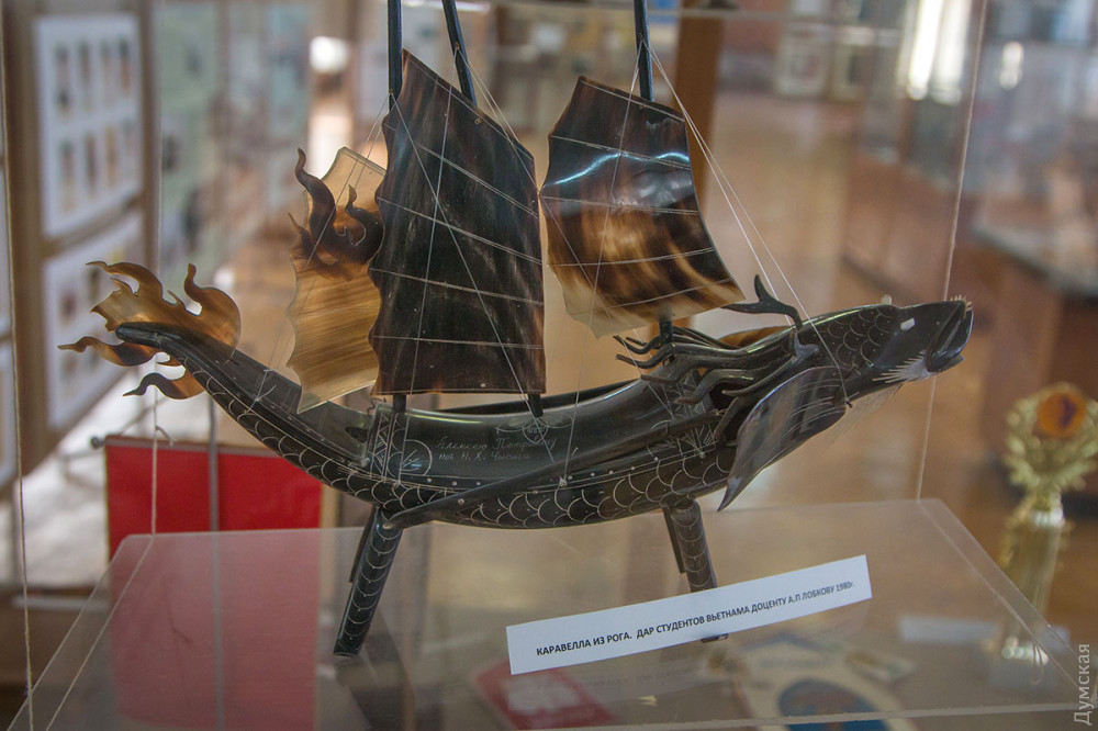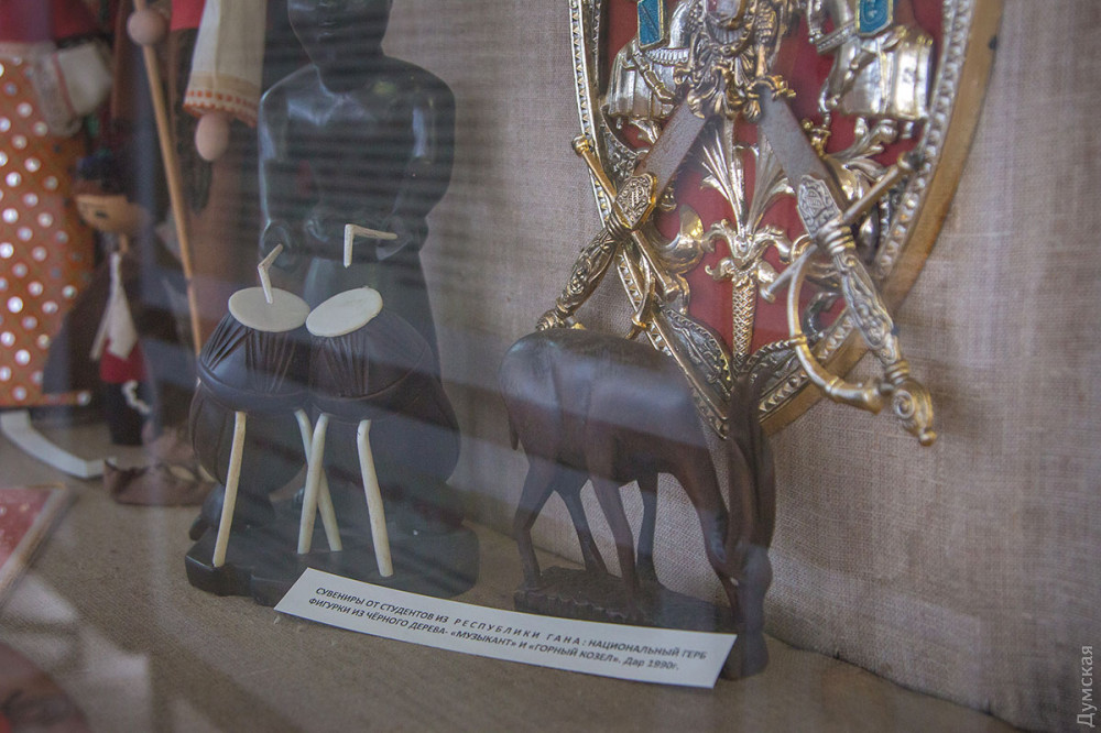 В отдельный стенд собраны всевозможные подарки, которые академии в разные годы презентовали международные делегации и иностранные студенты. Например, каравелла, вырезанная из рога неустановленного животного представителями Вьетнама, соседствует с национальным мужским халатом абитуриента из Йеменской республики и гербом Ганы из черного дерева.