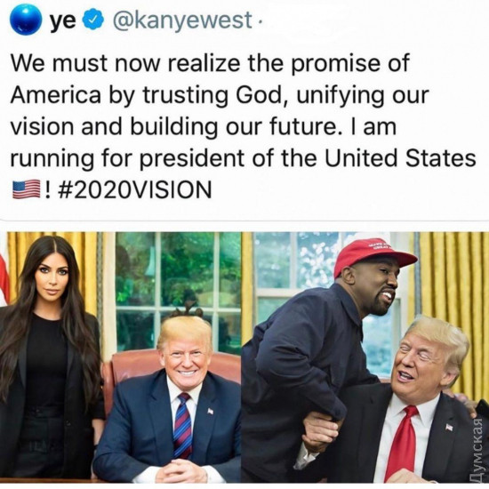 Муж Кардашьян собирается в президенты США: на радость Трампу рэпер сможет отобрать голоса у БайденаПопулярный американcкий рэпер и муж известной модели Ким Кардашьян Канье Уэст заявил, что баллотируется на пост президента США. «Мы должны исполнить данное Америкой обещание, веря в бога, объединяя наше видение и строя наше будущее. Я баллотируюсь на пост президента Соединенных Штатов», — написал исполнитель в Twitter и Инстаграме. Президент США Дональд Трамп позитивно отреагировал на появление такого конкурента и заявил, что музыкант сможет отобрать голоса афроамериканцев на выборах у Джо Байдена. «Это ему не составит труда. Коррумпированный Джо не сделал ничего хорошего для чернокожих», — заявил Трамп. Отметим, президентские выборы в США пройдут 3 ноября 2020 года. К слову, поддержку рэперу в кампании пообещал глава компаний Tesla и SpaceX Илон Маск. СМЕРТЬ РОССИЙСКИМ ОККУПАНТАМ! Заметили ошибку? Выделяйте слова с ошибкой и нажимайте control-enter |