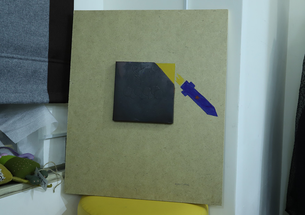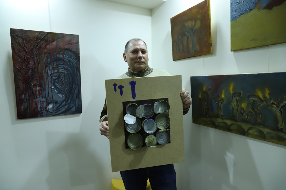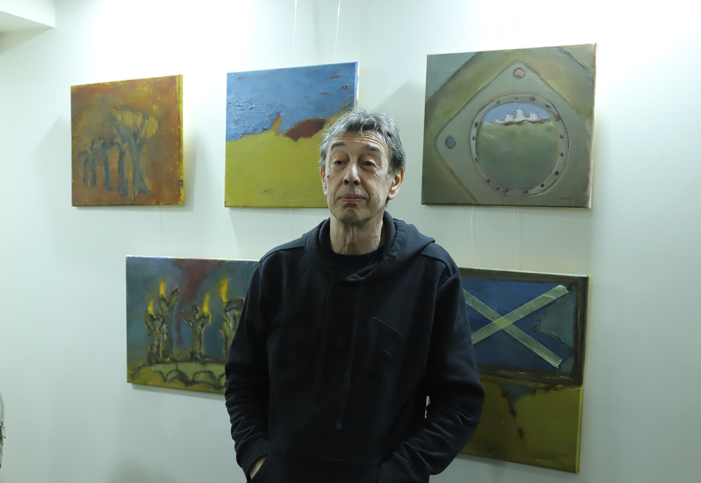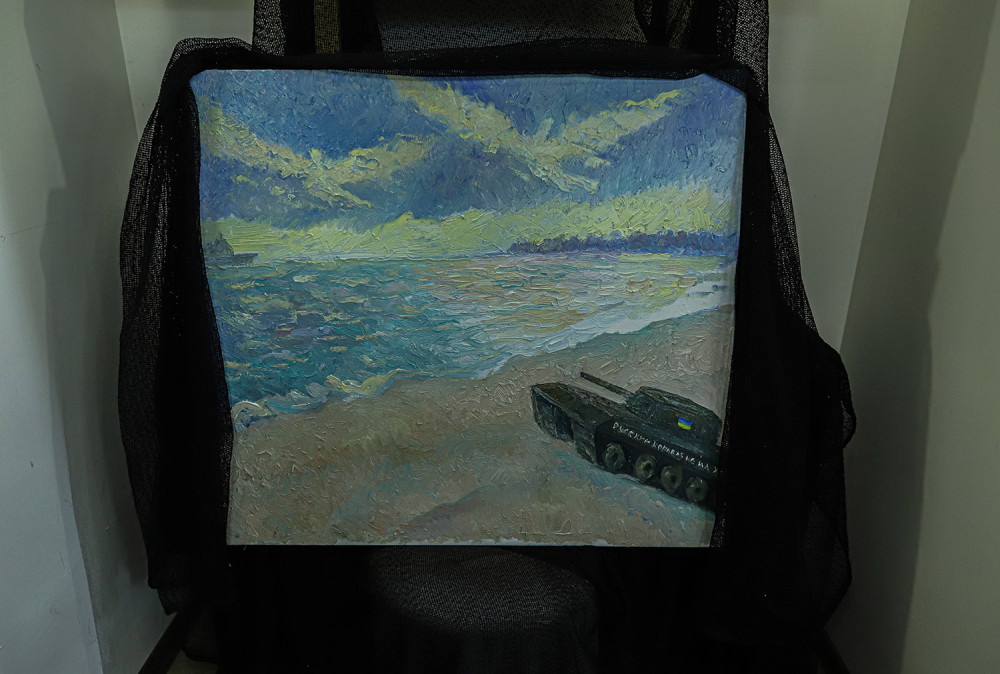 «Одна из моих картин называется: «Увидеть Одессу и утонуть», — говорит Валерий Юхимов. – Здесь мы видим российский корабль, который был подбит и затонул под Одессой, и это, собственно, вид из его иллюминатора. Эта работа выполнена после начала войны и созвучна сегодняшнему моменту».