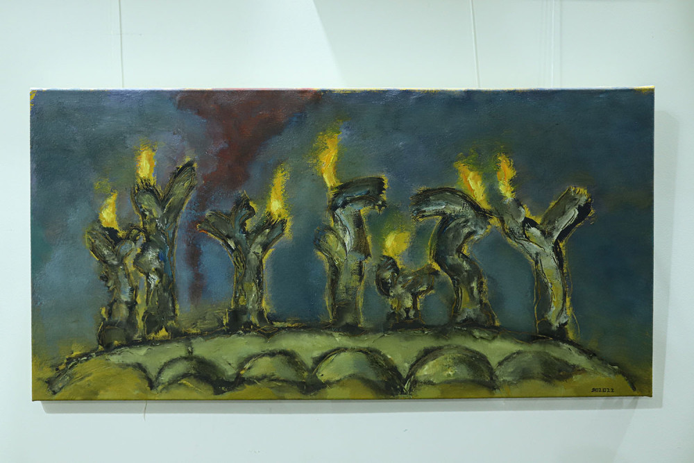 Сюжеты представленных картин резонируют с трагедиями военного времени, Лена Коламбет в коллаборации с Виталием Мисюковсцом создала инсталляцию, посвященную Мариуполю. А некоторые произведения написаны задолго до описываемых событий. Но мы же знаем, что мастера искусства часто оказываются пророками…