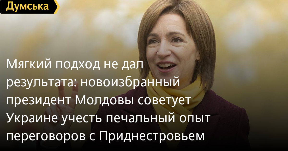 Санду предложила Украине учесть опыт Молдовы в Приднестровье. Так, Молдова согласилась на диалог с непризнанной «властью» в Тирасполе, а Россию согласилась считать «посредником», но переговоры между сторонами продолжаются до сих пор.