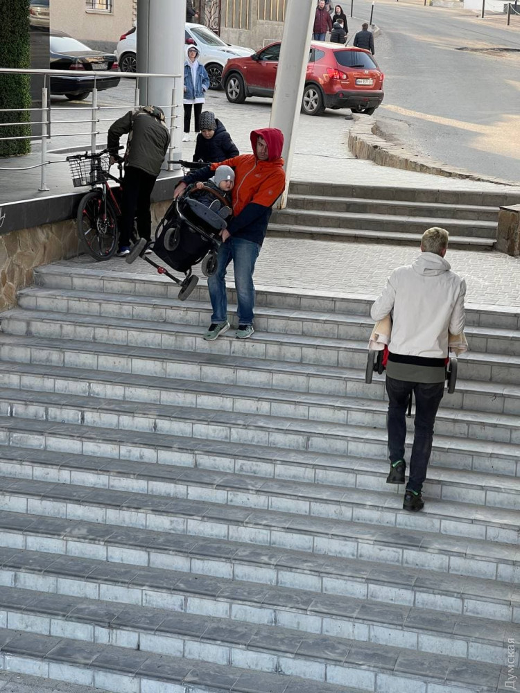 Как сообщает корреспондент «Думской», сооруженный пандус явно не соответствует установленным нормам (уклон пандуса должен быть не более 6 градусов), но, тем не менее, немного облегчает жизнь велосипедистам и людям с детскими колясками.