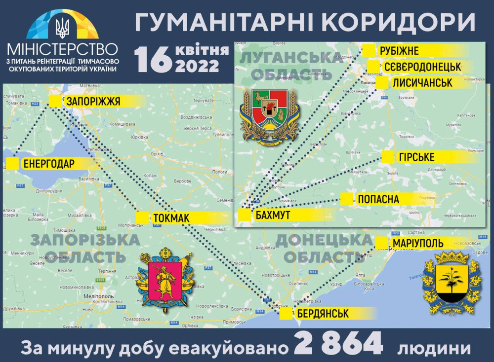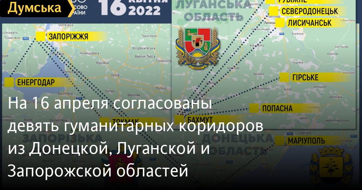 Девять «зеленых» коридоров согласованы на субботу 16 апреля. Из Луганской области эвакуация будет возможна только при прекращении обстрелов со стороны российских нацистов.
