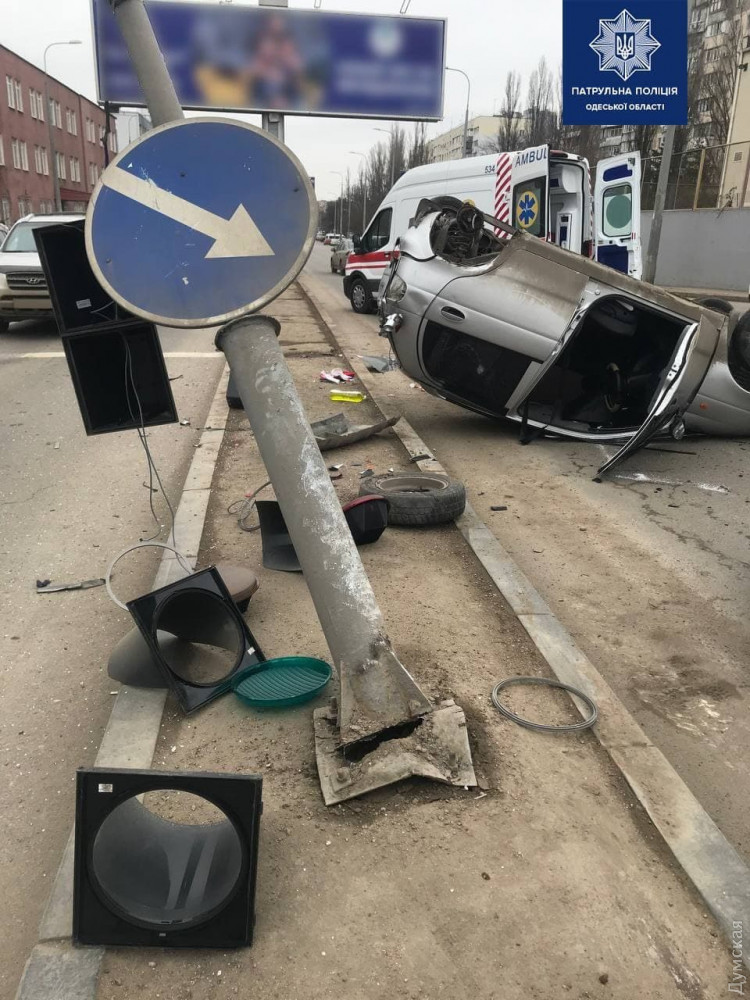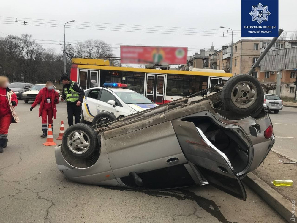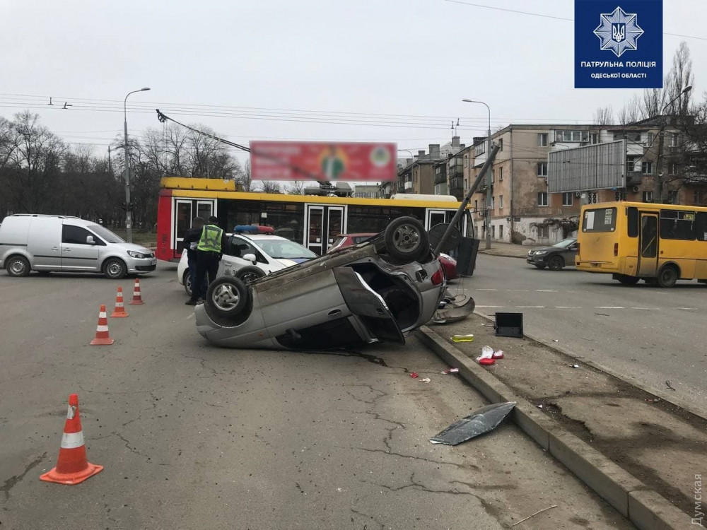 Daewoo Matiz врезался в троллейбус на перекрестке Балковской и Мельницкой улиц. От удара машина перевернулась, после чего повредила светофорный столб.